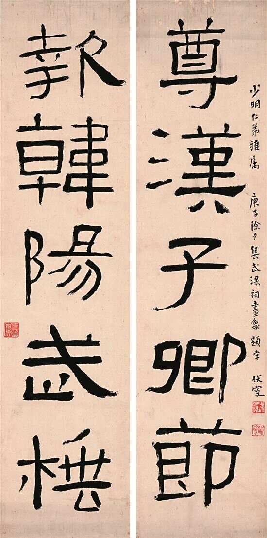■尊汉报韩五言联 吴子复 释文:尊汉子卿节;报韩阳武棰。(近墨斋 藏)