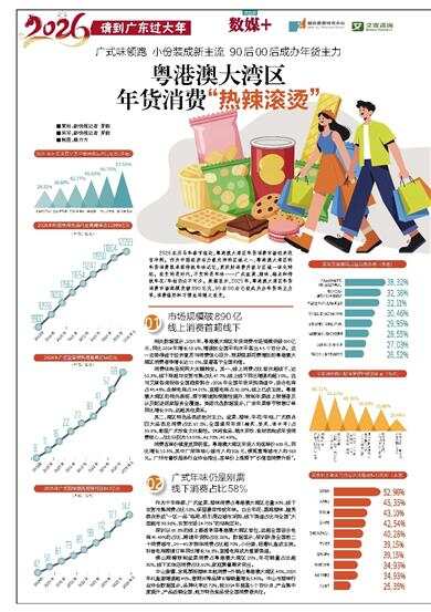 2026农历马年春节临近,粤港澳大湾区年货消费市场迎来收官冲刺。作为中国经济活力最充沛的区域之一,粤港澳大湾区的年货消费既承载传统年味记忆,更折射消费升级与区域一体化特征。改变的是时代,不变的是年味——广式盆菜、腊味、糕点和传统年花/年桔仍必不可少。数据显示,2025年,粤港澳大湾区年货消费市场规模突破890亿元,90后00后已经成为办年货的主力军,消费偏好和习惯也将随之改变。