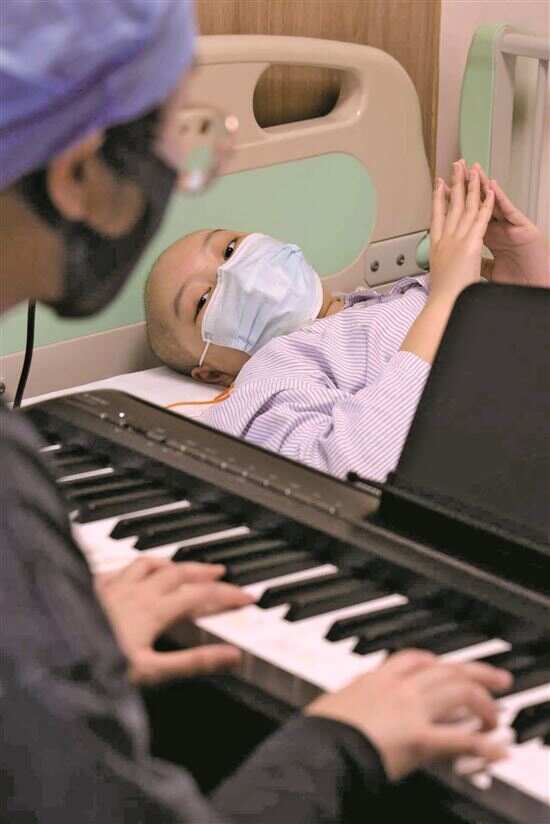 “刚做完腰穿,血小板也很低,只能平躺……”化疗后的小艾已卧床大半年,升板针的针头埋在手臂,稍一磕碰便可能面对危急状况。这个本应在校园里奔跑的女孩,被白血病困住了脚步,病房的白墙、冰冷的仪器,成了她生活的全部,病痛、寂寥时常将她包裹。直到音乐治疗师温蕴推着1.2米长的电钢琴来到床边,指尖流淌出会跳舞的“叮咚”,小艾低落的情绪才一扫而空,一曲终了,平躺在床上的女孩高高举起双臂,用力为温蕴鼓掌。这是音乐治疗的寻常瞬间,却藏着最动人的力量,在患儿虚弱,或无法动弹的时光里,有音乐的陪伴,能驱散枯燥时光,缓解不适。在中山一院的儿科病房里,这样的故事每天都在上演。