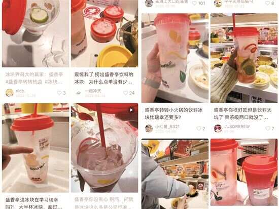齐嘉的遭遇其实不少人都遇到过。记者在社交平台检索“盛香亭 冰块”,发现有不少消费者发布了类似吐槽,“盛香亭你没有心,别问,问就是冰块这么多是公司标准,您家标准可真高。”“盛香亭你很好吃但是饮料太坑了,果茶吸两口就没了。”根据网友晒出的照片,好几个人饮品喝完后,杯中仍剩下2/3杯左右的冰块。