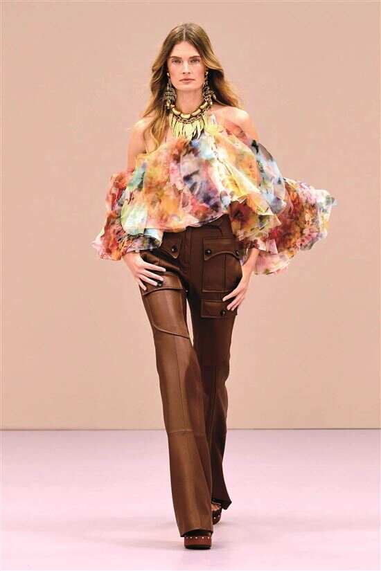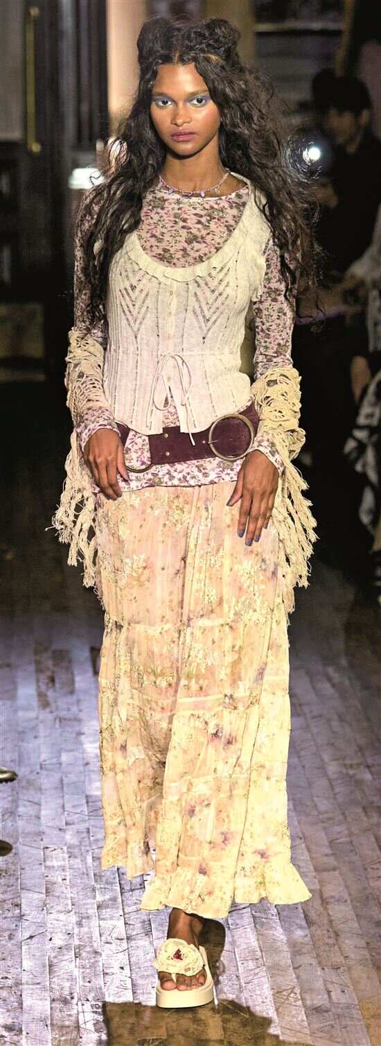 浪漫波嬉的核心内涵是自由、灵性与柔美的三重共生,萃取了波西米亚的自由灵魂,以流动廓形与层叠穿搭呼应游牧天性,延续嬉皮士的灵性追求,用自然材质与手工细节传递对本真的向往,同时融入浪漫主义柔美细节,以蕾丝、褶皱、柔和色彩中和叛逆感,从而形成粗粝与精致并存、野性与温柔共生的独特气质。快节奏都市生活中,人们既向往嬉皮士式的精神自由,又不愿舍弃精致美学;既迷恋波西米亚的异域风情,又追求穿搭的实穿性,这一风格令自由与浪漫的结合唾手可及,带蕾丝饰边的皮革胸衣搭流动的佩斯利印花长裙或随意搭在肩头的钩针披肩,都足以在穿搭中完成自由与柔美的游牧之旅。