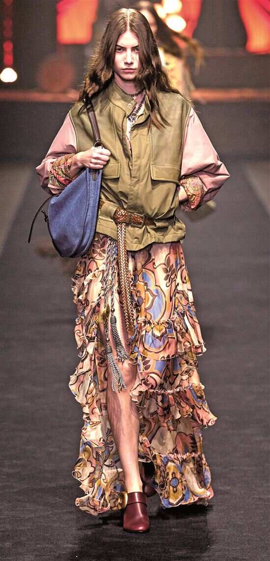 浪漫波嬉中的摇滚民族造型并非直白的朋克叛逆,而是将传统民族元素通过斑驳做旧、文字层叠与暗黑色彩等设计手法巧妙融入摇滚乐的反叛基因,打破民族风情的固有印象,塑造不羁的波西米亚风格。它汲取世界各地民族服饰的精华如印度刺绣、摩洛哥几何图案、墨西哥色彩碰撞等,再融入摇滚风格的利落剪裁与材质对比,形成柔中带刚的独特张力。