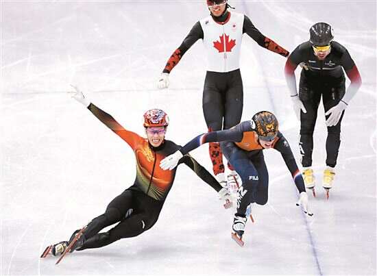 ■当地时间2月12日,在短道速滑男子1000米A组决赛中,中国选手孙龙(左)获得银牌。新华社发