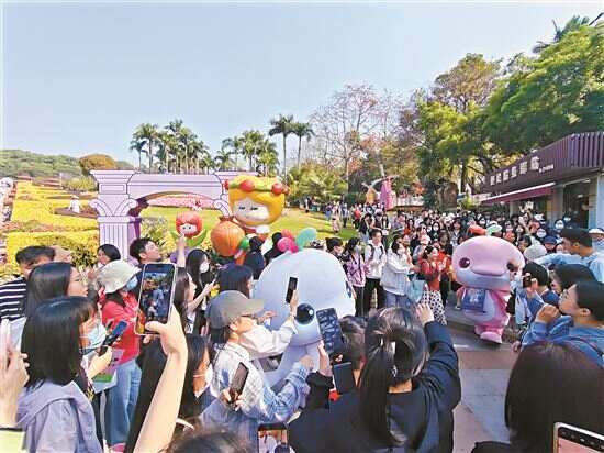 西湖路的越秀区花市上,6只大湾鸡携手亮相开市仪式,引得众多市民和游客驻足拍照。市民张先生手里提着两盆蝴蝶兰,另一只手则护着刚买到的“喜洋洋”公仔,他笑着对记者表示,自己是专门来找“白切鸡”的。“我们老广都说‘无鸡不成宴’嘛,去年全运会的时候,有朋友送了我女儿一个‘乐融融’,她就想着过年的时候能凑成一对,所以我在花市上就把‘喜洋洋’也买回来了。”