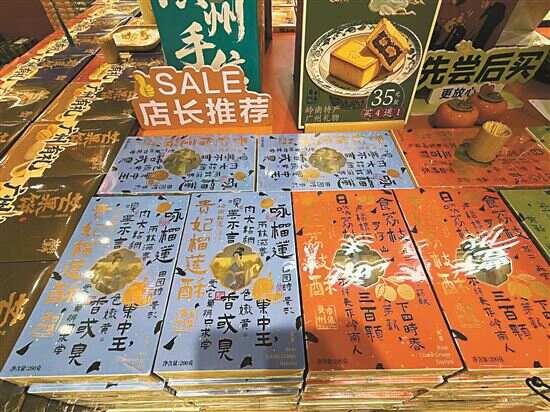 琉璃瓦下陈列着琳琅满目的广货:从潮汕手拉壶到佛山香云纱,从英德红茶到揭阳青梅酒,无不浸润着岭南风韵。途经“岭南特产商行”,摊主热情邀约:“新春快到了,一家老小都来逛逛。”店里鸡仔饼、茶糕、榴莲酥、荔枝酥等各种广式糕点零食琳琅满目,还有免费试吃!