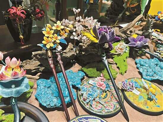 特别想推荐的是街巷里的“隐秘市集”。北京路南段圣贤里、书院街内化身“风物大集”,北京路管委会引入了植物手作、押花、缠花、绒花、景泰蓝等非遗工艺品小摊,形成一幅民艺业态,五光十色的工艺品价格从十几元到上百元不等。爱好汉服的江西游客清清走进越秀书院街的点翠发簪小摊,眼睛就挪不动了:“国风发簪配色、纹样都超级精致,搭配汉服和日常穿戴都适合。”