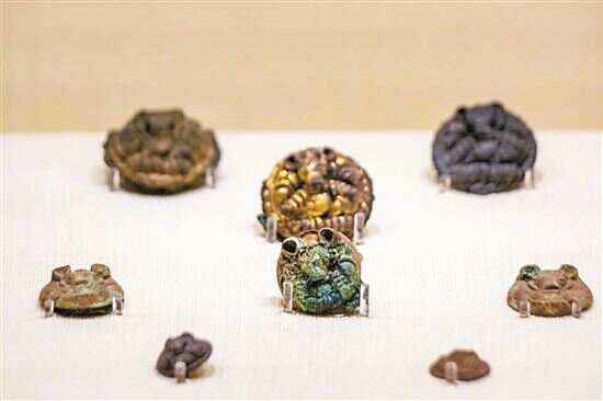 南越文王墓中出土64件熊形节约,分为大、中、小三种,呈半球形,球面铸有熊首及熊爪。它们呈半球形,球面的熊首与四爪突出,呈蜷缩状,像在吧唧吧唧啃咬着什么的样子。这款熊饰与南越王宫里的熊饰踏跺上的熊饰十分类似。