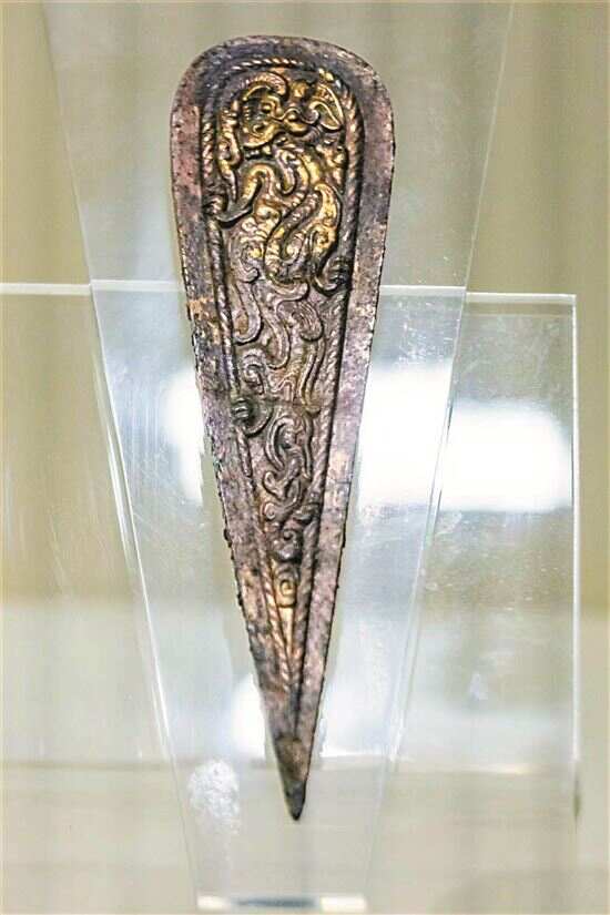 另外一件鎏金马器是鎏金熊形铜节约。“节约”是马嘴两侧绳带连接处的器物,有了它,相连的几条绳带就不容易走偏,产生节制、约束的作用。由于马具上有的带子需要交叉扎绑,此时节约用在交叉处,不仅可使绳带平整,也不会让绳结或金属在马运动中磨坏马的皮肤。这样一来,马具的绳带就不会乱成一团,马跑起来也不会被勒死了。我们现在所讲的“节约”也有“节制”的意思,它的原意可能就来自这种铜配饰。