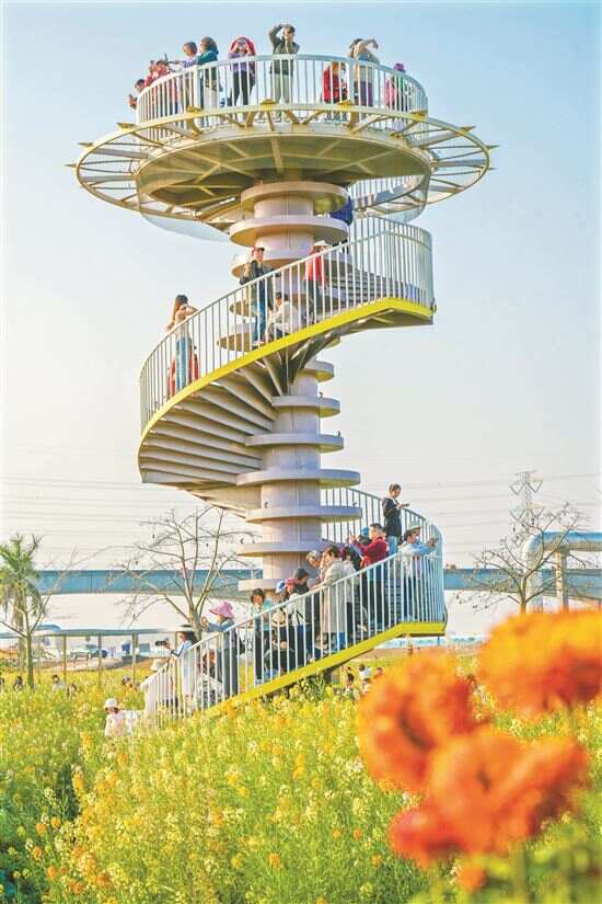 官坦农业公园便是东涌镇融合激活年味经济的典型范例。曾经,这里是一片闲置土地,与周边交通衔接较差。为助力“百千万工程”取得实效,促进城乡土地资源高效集约配置,东涌镇联合有关部门通过全域土地综合整治将零碎地块统筹起来,荒废农用地四季轮作观花类作物,规整永久基本农田种植粮食类作物,再结合栈桥、步道系统等组成游览网络等措施,将农业公园打造成农业科技、田园文化、湿地风光三合一的体验区。同时,保持乡土景观本底,建设成为丰富变化的都市田园,创造农旅融合的游憩体验。该项目通过耕地集中整治达成农业增产,通过吸引游客创造商机达成村民增收,通过修复河岸湿地形成五彩油菜花与高楼林立的大学园区交相映衬的优美画面,充分展现了南沙全域土地综合整治工作的成效,粮食安全、村民增收、生态修复“三赢”的局面逐步形成。如今,橘红色、粉白色、嫩黄色……南沙东涌官坦农业公园里约139亩梦幻般的七彩油菜花海,在大地上描画出油画般的美景。