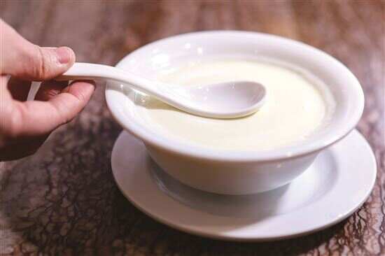 考验双皮奶的标配动作就是放一把勺子在表面上。