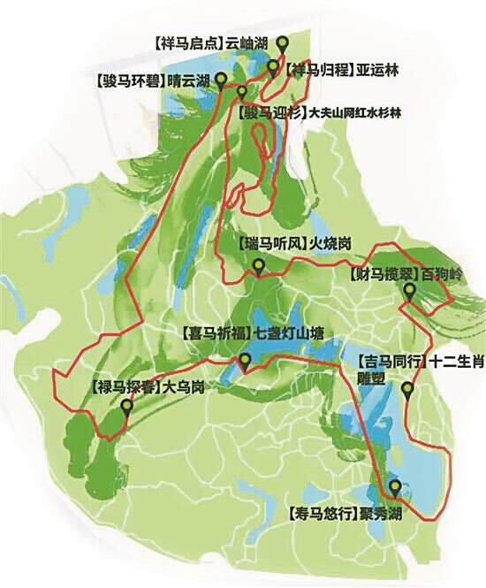 这条徒步路线的独特之处在于,巧妙地将马形轨迹与自然景观结合,前半段沿云岫湖、晴云湖步道行进,可赏湖光林影;中段深入大乌岗,登顶可俯瞰大夫山全景;后半段途经聚秀湖、火烧岗,穿梭于清幽林间,最后沿着网红水杉林步道返程,全程美景相随,各有各美。
