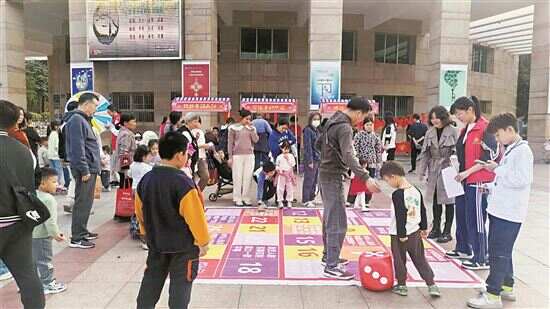 ■地面铺设“迎春闯棋关”飞行棋盘,市民每回答一道法律题方掷骰前行。