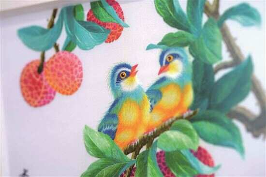 除了色彩,在刺绣作品上表现立体,也会使用渐变色,如在一层灰色之上再做一层浅灰,利用视觉错觉让人看起来觉得可能有两个色阶或三个色阶而形成某种立体感。但真正的实物如一朵红棉或一颗荔枝,由于受光面不同、土地肥沃程度不同,可能呈现出来的自然色泽就不同,刺绣作品也需要尽可能还原物品本身的真实色彩,所以渐变色在广绣作品当中的使用处理就变得十分常态化,也是想要“精”不容易的地方,“作品不会说话,但颜色会表达。”