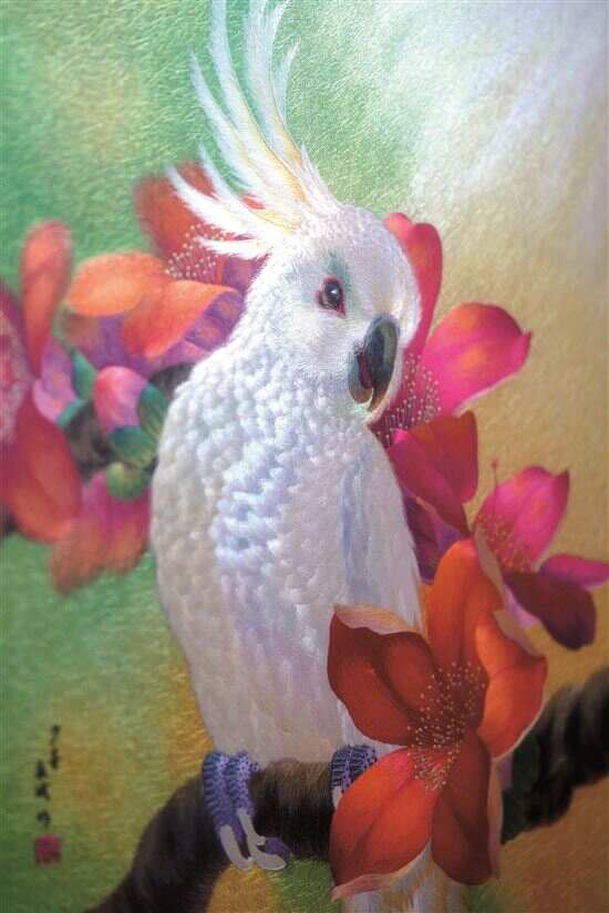 ■广绣作品鹦鹉与木棉花。