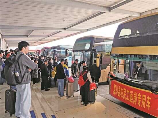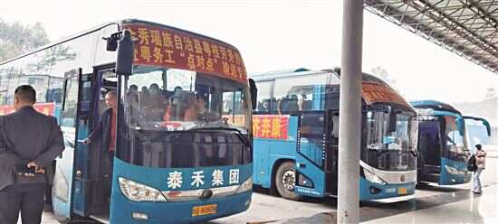 ■富川农民工返岗就业“点对点”免费送工专车。