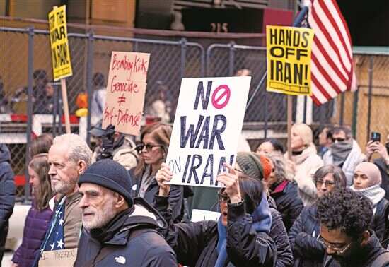2月28日,民众在美国纽约举行集会游行,抗议美国和以色列军事打击伊朗。