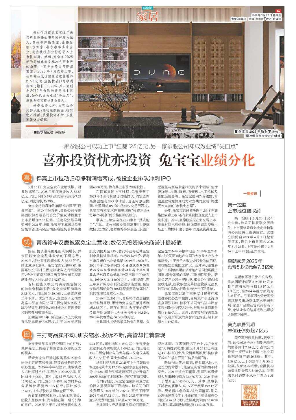 喜亦投资忧亦投资 兔宝宝业绩分化