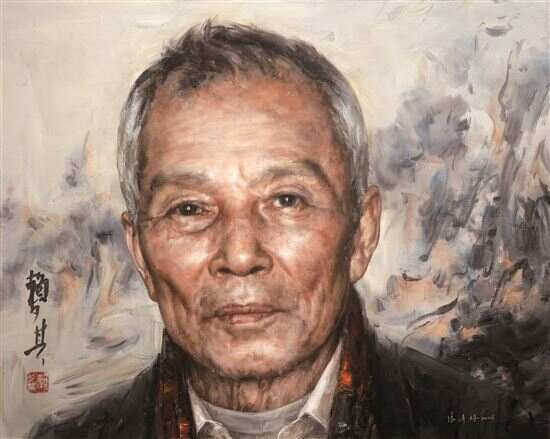 油画《赖少其——来自黄山的风》延续冯少协擅长的超大人物头像特写、具象写实造型手法,以赖少其晚年正面头像为核心主体,头像占据画面前景中心位置,视觉冲击力强烈。画面中,赖少其满头灰白发丝疏朗而略带凌乱,颧骨微突、皱纹清晰,面容镌刻着经历岁月风雨沧桑与病痛印记,却目光坚定、神情沉静坚毅,传递出生命不息、创作不止的执着信念。画家以精准细腻的笔触刻画人物形貌,形神兼备、栩栩如生,将晚年赖少其的精神气质、内涵修养与人格力量跃然画布之上。(梁志钦)