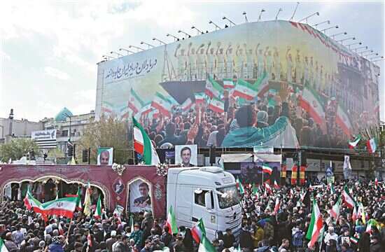 4月1日,在伊朗首都德黑兰革命广场,民众参加为伊朗伊斯兰革命卫队海军司令坦格西里、伊朗武装部队总参谋长顾问贾姆希德·埃哈基及伊朗武装部队军事人员举行的告别仪式。(新华社发)