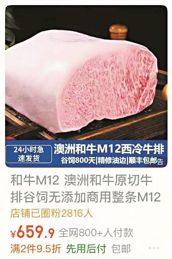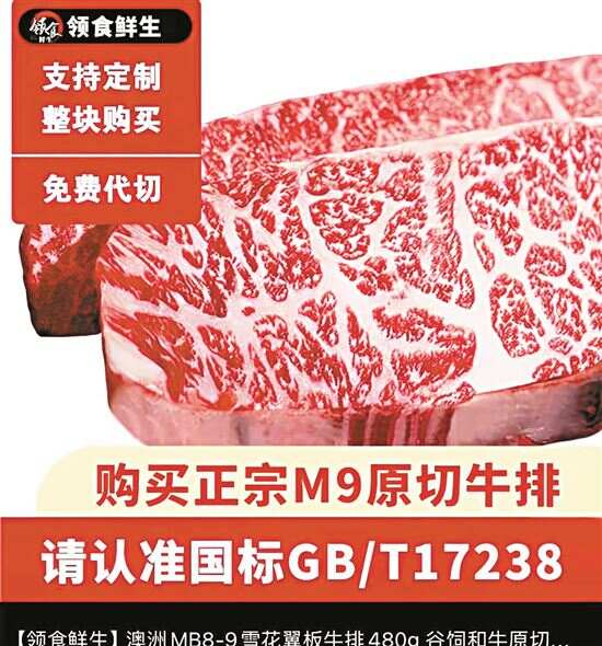 最为典型的,就是对日本和牛“A+数字”评级与澳洲牛肉“M+数字”评级体系的混淆与滥用。例如,尽管M9已是澳洲官方AUS MEAT大理石纹评分体系中的牛肉最高等级,但在部分电商平台上,仍频繁出现标注为M10甚至M12的“顶级和牛”,有的链接甚至卖了近千单。