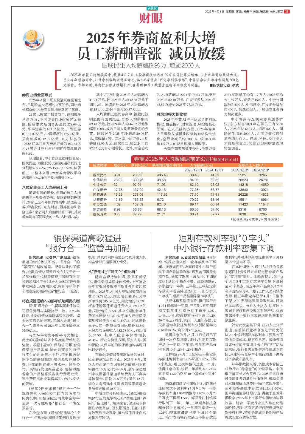 2025年券商盈利大增 员工薪酬普涨 减员放缓