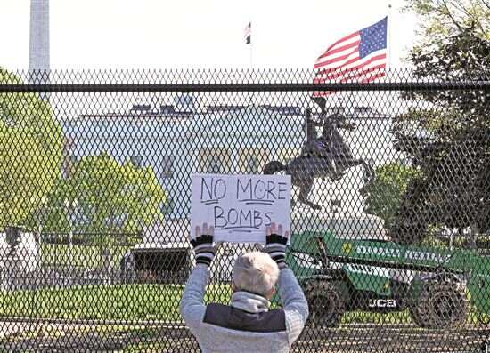 ■4月7日,一名示威者在美国首都华盛顿的白宫前手举标语。