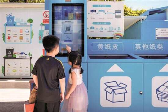 ■在广州市黄埔区联和街低值可回收物智能回收点,两名小朋友在进行相关操作。通讯员供图