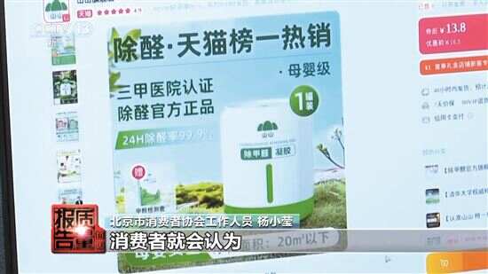 北京市消费者协会工作人员杨小莹表示,一款宣称在24小时除醛率达到99.9%,在宣传页面上会显示,净化面积是20平方米以下,同时还有一罐装的标识,消费者就会认为,一罐的凝胶就可以净化20平方米以下的环境。