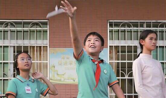 ■参加主题活动的小朋友放飞自制飞机模型一刻,露出开心笑容。