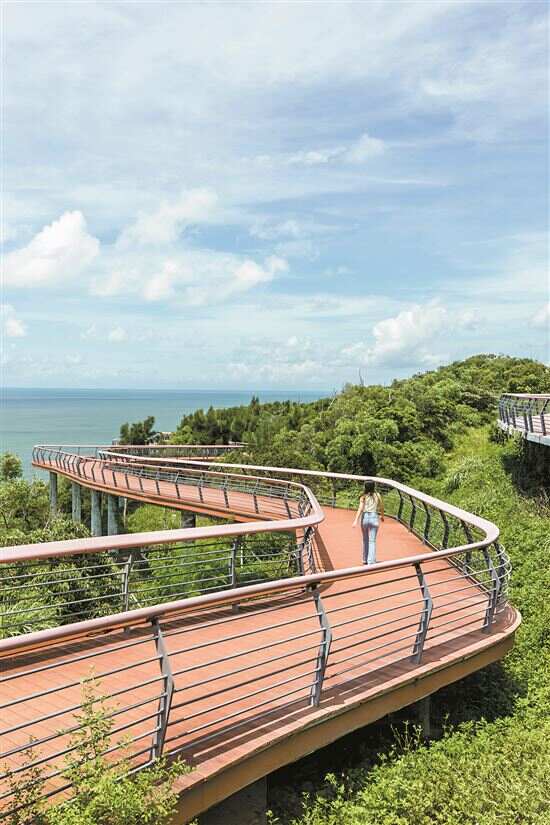 走出酒店,往右前方上坡,路过面朝大海的彩花秋千架,15分钟便来到了蜜月山风景区。木质栈道蜿蜒在山林间,山顶处的蜜月阁是一个三层高的小阁楼,登高后可以360度俯瞰全岛和海湾曲线,是观赏日落的绝佳位置。步行而上,山海间的清新空气扑面而来,也可以选择乘坐全景玻璃的“蜜月电梯”直接登高,下来时挑战刺激的“蜜月飞车”在蜿蜒滑道上看山海。