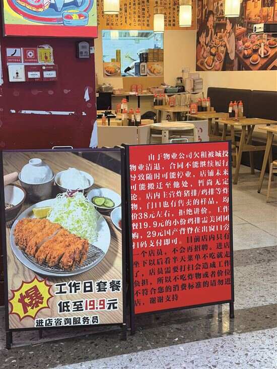 部分仍开业的商铺门口张贴着“因物业公司欠租被城投物业清退,合同不能继续履行导致随时可能停业”的告示牌。