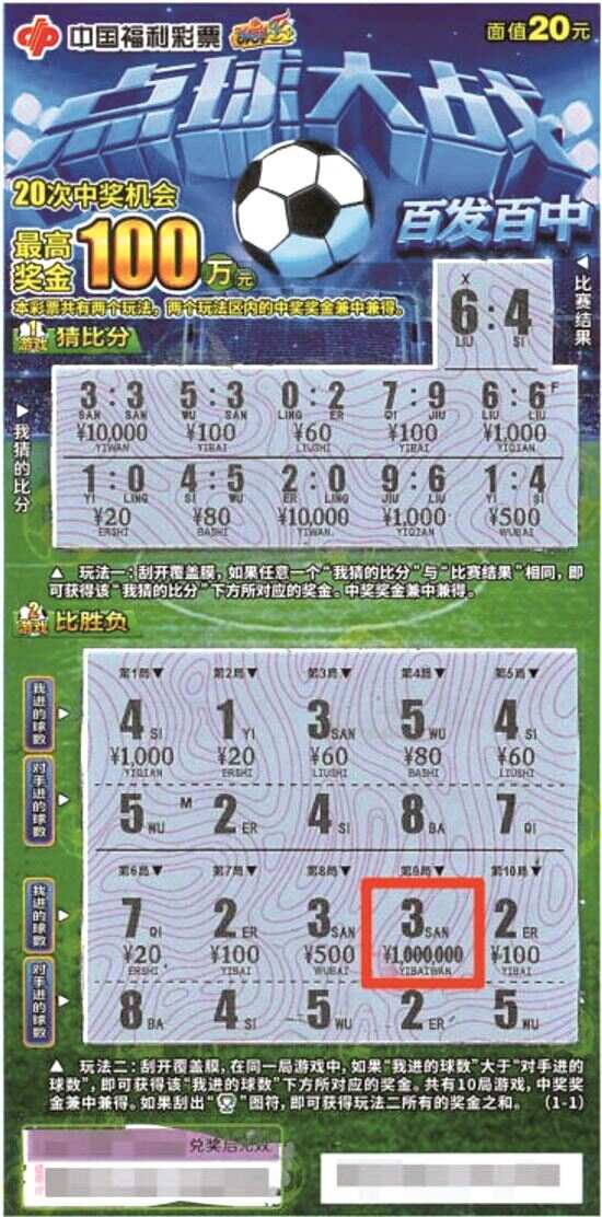 “百发百中”刮刮乐即开票以足球为主题,自上市以来深受购彩者喜爱。票面设计精巧,“我进的球数”和“对手进的球数”用足球表现,“特殊图符”用奖杯表达,生动呈现足球运动的魅力。“百发百中”即开票有5元、20元两种面值,其中20元面值的最高奖金为100万元。