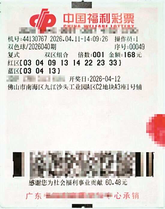新快报讯 记者陆妍思 通讯员袁苏华报道 双色球第2026040期开奖中,全国共中出一等奖13注,其中1注花落佛山市南海区44130767福彩销售站点。中奖彩票是一张“8+3”复式彩票,中奖奖金661多万元。
