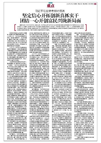 据新华社电 中共中央总书记、国家主席、中央军委主席习近平近日在甘肃考察时强调,要贯彻新时代中国特色社会主义思想和党的十九大精神,坚持稳中求进工作总基调,贯彻新发展理念,坚定信心,开拓创新