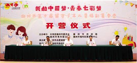 活动开营仪式上,潮州市团市委书记邱灿华为夏令营领队代表授旗,潮州市民政局副局长尤晓俊为孩子们发放活动用品,少先队员代表们也为台上领导佩戴红领巾。 福利彩票发行中心多年来始终将“扶老、助残、救孤、济困”的发行宗旨铭记于心,为社会筹集公益金,投资建设公益项目。注重青少年儿童的成长发展,为留守儿童提供更好的学习环境,拓展留守儿童的知识视野。未来市民政局和福彩中心将会继续践行“民政为民,民政爱民”的宗旨,始终如一关心留守儿童的成长发展。希望孩子们能珍惜这次福彩夏令营的学习机会,从中学习新知识,砥砺德行,为中华之崛起而读书。 在三天夏令营之旅中,孩子们接触到多姿多彩的学习内容,包括参观和合陶瓷文化科普基地,学习传统陶瓷拉坯和彩绘制作,锻炼孩子们的动手能力;参加各类野外拓展游戏,增强孩子们的户外锻炼能力等。 福彩夏令营已经走过第十个年头。相关负责人表示,今后,潮州市民政局和福彩中心将会一如既往关心、帮助潮州市留守儿童的生活和学习。希望全社会都能多多关注留守儿童这一特殊群体,共同编织留守儿童七彩梦。