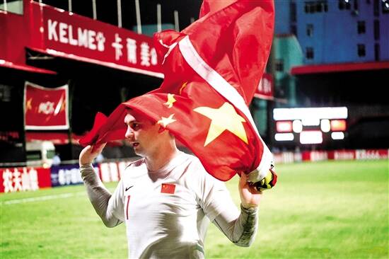 ■9月10日,中国队球员艾克森身披国旗庆祝比赛胜利。新华社发 |