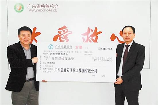 ■广东雄资石油化工集团有限公司董事长吴海冰(右)向广东省慈善总会捐资130万元用于扶贫济困。 |