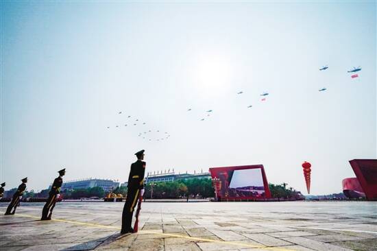 ■ 10时43分,空中护旗梯队拉开了阅兵分列式的序幕。随后,20架直升机组成巨大的“70”字样,象征中华人民共和国走过70年光辉历程。 |