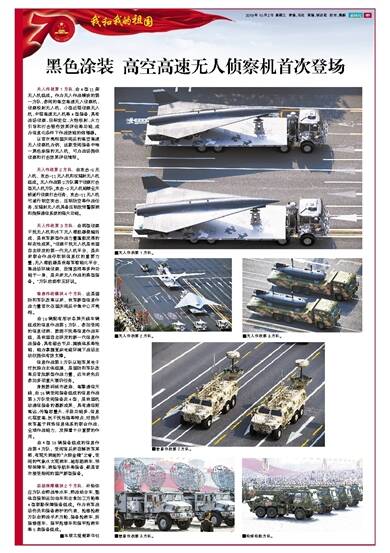 无人作战第1方队:由4型11架无人机组成。作为无人作战模块的第一方队,参阅的高空高速无人侦察机、侦察校射无人机、小型近程侦察无人机、中程高速无人机等4型装备,具有战场侦察、目标定位、火炮校射、火力