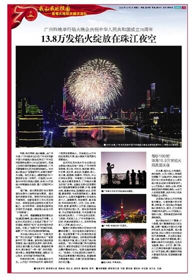 昨晚,珠江两岸,焰火璀璨。由广州市委、广州市政府主办的广州市庆祝新中国70华诞焰火晚会在珠江广州市区河段琶洲会展中心对出江面举行。花城上空绚烂烟花随着音乐盛情绽放,广州用最璀璨的礼花为祖国母亲献礼