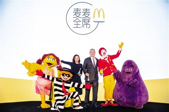 ■麦当劳中国董事会主席张懿宸先生(右三)、麦当劳中国首席执行官张家茵女士(左三)、麦当劳叔叔(右二)、奶昔大哥(右一)、大鸟姐姐(左一)、汉堡神偷(左二),为“麦麦全席”开席。 |