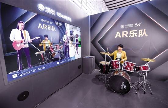 在乌镇“互联网之光”博览会现场,一名观众在体验基于5G技术的远程AR乐队表演。 在5G环境下,戴上耳机和VR眼镜,仿佛置身于音乐会现场,整个乐队环绕着你进行演奏。坐在架子鼓前,屏幕上出现一位吉他手和贝斯手,一支乐队隔空组建成功。一起完成一次演奏,生成一支单曲,扫描二维码下载,人人都体验了一把“乐队的夏天”。 “这款增强现实应用需要5G网络的大带宽进行高清视频采集和高性能的计算,实现视频的实时处理,最终实时获取合成视频。”中国移动展区一位工作人员介绍。 新华社发