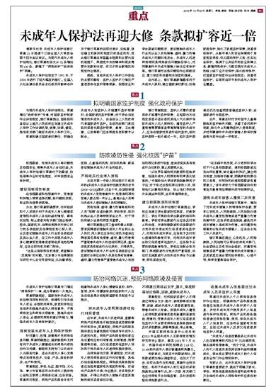 据新华社电 未成年人保护法修订草案21日提请十三届全国人大常委会第十四次会议审议。与现行未成年人保护法相比,修订草案的条文从72条增加到130条,新增了“网络保护”“政府保护”两章。