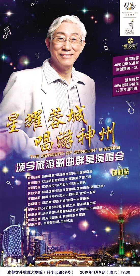 年逾七旬的中唱广州著名词曲作家吴颂今,从事专业音乐创作50年之久,超过200首词曲作品荣获创作奖,《风含情水含笑》《茶山情歌》《女孩的心思你别猜》《你那里下雪了吗》《情哥去南方》《我的老班长》《军中绿花》《灞桥柳》《拾稻穗的小姑娘》《小手拍拍》等歌曲广为传唱,影响了几代人,同时,他还是乐坛著名的伯乐,“颂今老师"的美誉人人熟知。 11月9日,吴颂今将携陈思思、任妙音等弟子,联同四川歌手一同,在成都世外桃源大剧场举行他的作品演唱会。届时,他为成都新创作的歌曲《成都成都》,将作为演唱会的主题歌首次唱出。 “《颂今旅游歌曲群星演唱会》,其中一个重要内容便是歌唱成都旅游风光的歌曲。”吴颂今透露,自己在成都度过了童年,这座美丽的休闲城市给了他原始的艺术灵感。他怀着感恩的心,把自己最好的作品,献给川蜀大地的父老乡亲。 怀有浓浓成都情结的吴颂今,专门为此次演出创作了一组天府风情的歌曲新作,包括晚会压轴的百名歌手大合唱《成都成都》,用四川方言演唱的《成都小吃》,还有为老成都童谣精心谱写的《胖娃儿胖嘟嘟》《王婆婆卖茶》《三岁娃娃穿红鞋》等川味儿歌,都将在本次音乐会首演。