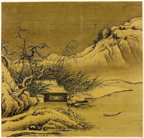 山林、房舍、江渚皆银装素裹。沉郁杳渺的天空,有两只朦胧的高飞黑鸟。房舍的轩窗洞开,内有二人对坐弈棋,虽只勾衣圈脸,寥寥数笔却将人物对弈时凝神注目的神情跃然纸上。一渔翁正在向房舍划桨而去,似是着急为其送上佐酒的鱼鲜。即便是这样寒冷沉寂肃杀的冬日,无论是大自然还是人物活动,依然蕴藏着勃勃生机。 画面左侧署“臣夏圭”三字款。构图采取半边式局部取景,笔法凝厚苍劲、浑融含蓄,于疏松中见俊秀。山石多用小斧劈皴和短线条皴禿笔直画,有着方硬奇峭、水墨苍润的艺术效果。作画用水较多,画面更显温润秀逸,水墨淋漓,人称“拖泥带水皴”,又喜在染后用秃笔焦墨点垛,所谓“泥里拔钉皴”。天空和水面略染淡墨,以烘托雪的洁白,营造寒气袭人的气氛,也显得深远渺茫,意蕴悠长。经历近千年时间的白绢已发黄变暗,而山顶、屋脊、枝头用蛤粉点染的白雪,依然晶莹璀璨、历久弥新。 马远、夏圭虽皆师法李唐,但各有特点:马画意深,用笔刚劲偏于刻露;夏画趣胜,用笔刚劲趋于含蓄。受禅宗影响,夏圭主张“脱落实相、参悟自然”,趋向笔简意远、遗貌取神。虽缺少马远画中那种富贵、矜持的气息,却多了几分散淡、荒率的野趣。 (林木——最美山水画100幅)
