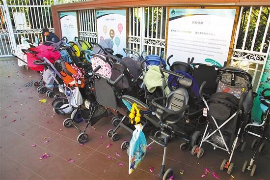 ■在广州市越秀区一家幼儿托育机构门口,停放着不少宝宝手推车,显示广州市的托育需求旺盛。 新快报记者 李小萌/摄 |