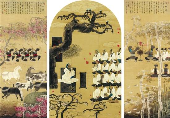■收藏周刊记者 梁志钦 用当代的造型不加改变地来表现古典人物 收藏周刊:山水画家以道家思想为依归,您表现孔子题材,是否有想过如何把儒家思想作为艺术追求的一部分? 孔维克:中国人物画的主流思想一直是“文以载道”。我的人物画创作有几个系列,其中有关儒家文化的就是孔子系列,另外还有近现代人物画创作,代表作应该算是《公车上书》《孙中山在青岛》等。我的这些现代人物画作品从精神层面来说与古典题材的文化追求也是相通的,都是通过反映生活来折射儒家文化精神。但两个系列的表现手法是完全不一样的,孔子系列更多的是用传统工笔手法描绘,是一种融进当代性理解的新的工笔画形式。这主要体现在构图以及用线和造型意识上,就构图来说适当融入了一点西方构成的元素,包括装饰性的归纳、平面化的处理等。就造型讲,既延续了高古的神韵,同时也融入了当代画家对造型的理解,因为古人对解剖、比例不太注重,在造型上既要适当强调形体结构及比例,又要保持一种“古味”。就用线来说,我加强了疏密对比及程式化的解构,使之既高古又有现代感。这方面探索的代表作有《杏坛讲学》及配画《习射图》和《古乐图》所构成三联画、《心学宗师王阳明》等,这算是我在传统与当代融合的探索上有自己特色的作品。 之所以我的这个系列与现代水墨人物画的面貌和艺术感觉拉开了距离,是因为我认为用当代的造型不加改变地来表现古典人物,有点不伦不类之感,形式与内容不统一,就像现代人不理解传统的招式而用话剧形式生硬地演古装戏。曾经也有人用写实油画来画孔子,感觉就很不协调。 收藏周刊:您创作孔子的核心表达是什么? 孔维克:表现孔子及其时代的人物,造型处理只是其中一个方面,把心中对孔子作为儒家文化的精神形象表现出来才是关键。这就要求自己首先投入到传统文化中去浸润,然后再融入现代性元素创造出一种当代性的古典样态来,我称之为“新古典”。比如2016年“杭州中国画双年展”特邀我参与作品创作,主题是“正大气象”,要求画中堂。刚接触这个命题时,我马上想到的题材就是画孔子,“正大气象”与儒家文化的内涵非常契合,一开始我的构思是中间一幅画,两边配以重色底子的对联,后来才知道每人有8米的展线,要用一组画来表现。最后决定在左右两边再各加两位人物,即孔子与“四配”:子思、颜回、孟子、曾子,一共是五幅画,这样安排不仅内容序列统一且形式感较强,形成一个气场。在做完草图后,又发现了问题,在画作的左右两边应该再配上重色底子的书法,以与中间的孔子像对联相呼应。 收藏周刊:书法内容如何定? 孔维克:这是一个十分关键的问题,因为左右两边的书法按照适合的行笔大小,可以各放下一千多字,如果我要想偷懒,找一点《论语》或者历代儒学者的金句,拼凑抄写一下足以达到视觉上的效果。但我认为每一次创作,都要给自己设置障碍或称设置新的课题,以让自己通过每一次创作都能得到一次艺术能力的提升。譬如孔子像两边的这副对联“志道据德千秋垂范 依仁游艺万代师表”,我就没有用现成的联语。也是自己化用《论语》的句子重新创作的。经过调查了解到多数人对孔子及其儒家的历史、定位、当代价值不甚清楚,所以决定了自己撰写两个文本,即《孔子思想与当代价值》《儒家文脉与代表人物》两篇来配画。实践证明,这样处理的确使画面增色,经过这一次创作也让我对儒家文化的认识起到了很大的深化作用。 我把线、面、光影以及古人的笔法,有机地融合在了一起 收藏周刊:在现当代人物方面,您如何探索? 孔维克:我的写意人物画,应该算是刚才所说那种“五四”以来的创新性的现代水墨写意人物画,即“徐蒋体系”这个文脉。这是在继承传统人物画笔墨的前提下,再结合西方造型艺术的要素进行融合改良的全新型人物画,非常符合中国的社会形态和新时代对人物画的要求。包括题材的选择、构图形式、速写的训练以及明暗光影,形体塑造等方面都需要人物画家认真去探讨。 “徐蒋”二位先生将这个框架奠基后,延续下来第二代像杨之光、方增先都对这个体系有所推进,杨之光结合光影表现形体比较成功,尤其在没骨人物方面的探索,而方增先则去掉光影,他从传统中国画的笔墨上汲取营养,尤其是从花鸟画技法上找到了借鉴。他们俩在探索的融合上比较自然,再后面,则有刘国辉、吴山明,北方有周思聪、卢沉等一大批画家,人物画的面貌也逐渐增多。我们这批人物画家算第四代,人数更多,面貌也更多样。 我是将古典人物和当代写意人物并行探索前行的,在写意人物画方面,我觉得我个人跟其他人不一样的地方,除了对笔墨个性化的理解外,在整体的呈现上,也与大家有所不同。因为前几代画家,很少有画大画者,一旦画起大画来,容易琐碎。而我在大画的创作上,则有了不少的探索, 而且在整体的把握上力求雄浑勃郁、整体气势,细微的表现上追求精到极致、讲究笔墨,在造型上注重当代性严谨结实感,我把线、面、光影以及古人的笔法,有机地融合在了一起。我们这代画家,都受过西方造型艺术的训练,但很多人画中国人物画,像拿毛笔画素描。我在中国画用线与光影的契合上,力求避开西画素描的影子,作出了个性化、中国式的呈现,应该说也受到了同行们的认可。 收藏周刊:人物