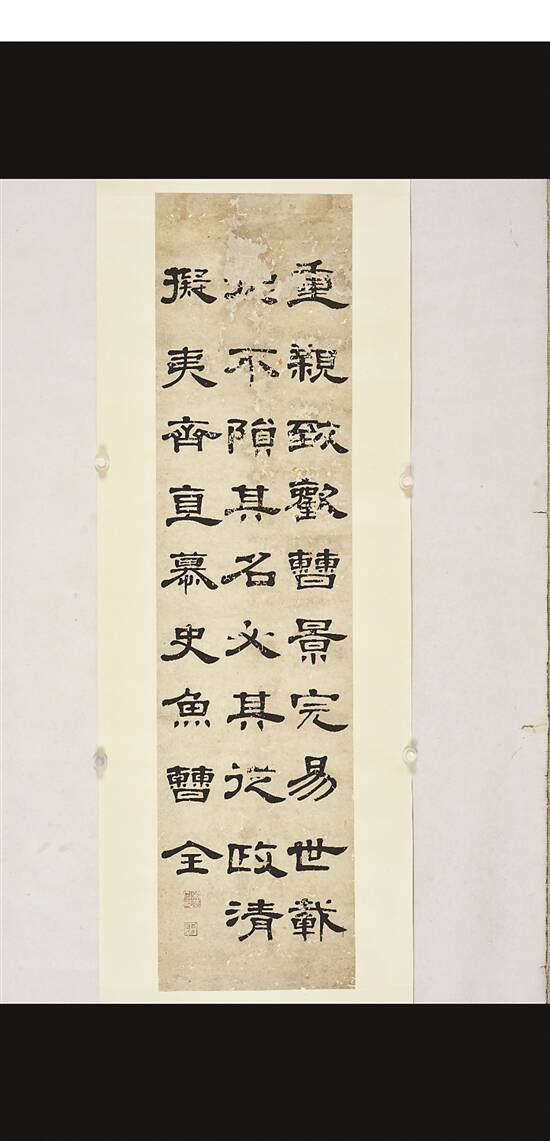 从书体发展规律来看,从记述性到实用性再到艺术性。隶书一体,肇于秦末汉初,从缪篆到生成再到隶变走向成熟,成为重要的书体。晋唐代以后,随着楷书的产生与发展,逐渐失去其实用价值,为楷书所替代。因此,隶书只成为一种艺术性书体。清初,汉碑出土者并不多见,学隶书者多学蔡邕的《熹平石经》,取法单一,堂奥不广,无足名家。一直以来,岭南书法仍保持着隶书的传统。岭南地区的隶书创作,以顺德的家族式书画传承的书家为主流,陈恭尹是其中最有代表和影响的一位。迨至清中叶,金石考据学的兴盛,汉碑摩崖大量发掘,给研究者提供学习的资料。嘉庆年间,隶书大家伊秉绶宦粤,传授隶书,彭泰来、刘华东等人,余子风从,形成群体,有效促进了岭南地区隶书的复兴与发展。黄丹书、 黎简、张锦芳、冯敏昌、吕培、张思齐、潘绍经、彭泰来、刘华东、明炳麟、谢念功等人为隶书名家。 黄丹书(1757—1808),字廷授,虚舟道人。顺德人。乾隆六十年(1795)举于乡,官教谕。无意仕途,辞官返乡后,与吕翔、黎简、张锦芳结为好友,诗书画雅好,形成书画圈。其诗出入唐宋诸家,尤近东坡,著有《鸿雪斋诗钞》、《胡桃斋诗馀》。 岭南偏于一隅,清代书法可与江浙一带的书家抗衡者,实属少见。清初的陈恭尹的隶书,成就不在郑簠之下;清中叶的黄丹书和黎简是其中最有影响的两位。 黄丹书与黎简是挚友,互相砥砺,黎简生前嘱托他撰写《明经二樵黎君行状》一文,可见他们之间的深厚情谊。两人在隶书研习上,相互影响,有着共同的审美取向。黎简以《熹平石经》为依皈,旁及《夏承》诸碑,稍有描画之迹,因此,他的隶书成就却没有其行草书显著。黄丹书同样以《熹平石经》筑基,广取《曹全》《乙瑛》《衡方》《史晨》《夏承》诸碑,丰富了他隶书的结体和用笔,仍以汉隶的正面取势,笔画平正而遒劲,气势沉雄,与同时的伊秉绶有暗合之处。 黄丹书的隶书可与江浙一带好手抗衡。我们可从马国权先生“较之享誉一时的金匮钱泳,书艺是高出许多”的评语中得以印证。 黄丹书虽以隶书著称,在传世的墨迹中,以行草书居多,隶书作品较为少见。无聊斋藏其《节临曹全碑》条屏(如图):“重亲致欢曹景完易世载德不陨其名必其从政清拟夷齐直慕史鱼曹全”,钤有:“黄丹书印”“虚舟道人”朱文印各一钮,纸本,纵136厘米、横34厘米,此屏只钤印章,无落款,应为四屏中的一屏。曹全者,字景完,敦煌效谷人也。《曹全碑》乃东汉时期隶书的代表作,字形扁平匀称,娟秀清丽,舒展超逸,风致翩翩,具笔画正行,长短兼备的特点。此轴是其晚年的临习之作,深得原碑意趣。用笔以中锋为主,间有侧锋,笔道变化合度,避让伸缩,天趣盎然。笔画轻重、粗细相间,提按虽不分明,但使转圆通自如,点画并不轻滑,自然轻盈,随情而动。用墨以润墨为主,润而不滞,朗朗情怀跃然纸上。章法以字距疏朗,行距紧凑为则,字距与行距之间,疏朗、紧密有致。细品此轴,通篇闲适自然,超然物外。虽为临习之作,但字字珠玑,几无懈笔,乃黄氏隶书的代表作。 在顺德书画家族中,以黄丹书为代表的黄氏家族,是顺德历代书画世家中传承时代最为久远的家族,历经乾隆、嘉庆、道光、咸丰、同治、光绪,传承了五代而不衰落,此乃在中国书画史上并不多见的个案。其传承脉络为:黄丹书——黄玉衡、黄玉霞、黄玉绳——黄乐之——黄统——黄建藩、黄建笎兄弟。黄丹书的书法,楷书取法柳公权、欧阳询、虞世南法帖,行书取法王羲之、王献之、颜真卿、孙过庭法帖;擅长墨竹、山水画,取法李煜、夏昶诸家。其他成员书画研习承传了黄丹书的家学书画渊源,并有所发展。尤其黄玉衡、黄乐之、黄统、黄建藩和黄建笎兄弟都考取功名,外出做官,视野开阔,取法多方,各有成就均以隶书著名。在书画方面,最有才华者当数黄玉绳,隶书成就突出者有黄丹书、黄统、黄乐之、 黄建笎三人。