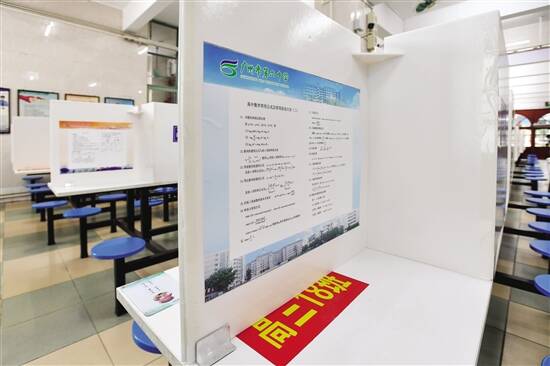 ■广州市高三、初三学生将于4月27日复课。广州市第六中学食堂餐桌隔板上印上了各学科的复习资料。新华社发
