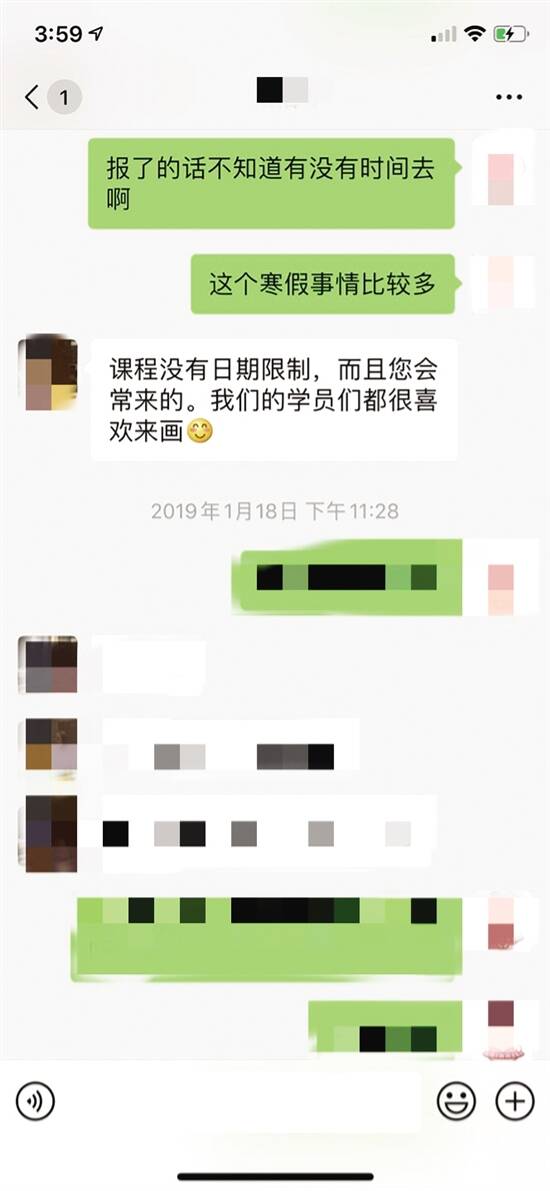■消费者提供的聊天记录显示,涉事画室方面曾承诺课程无期限。 受访者提供 |